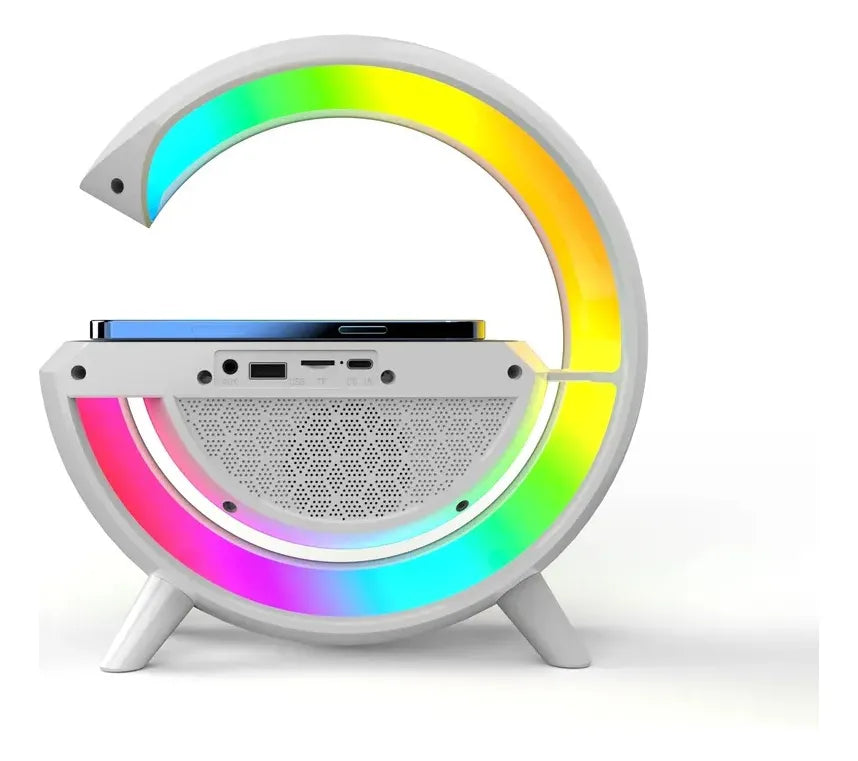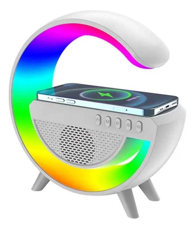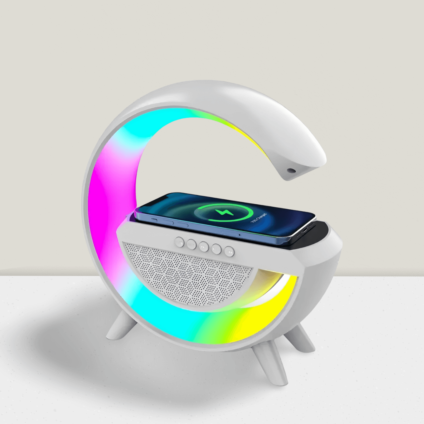 La Lámpara Parlante 3 en 1 combina luces RGB, parlante Bluetooth y cargador inalámbrico en un diseño moderno y portátil.